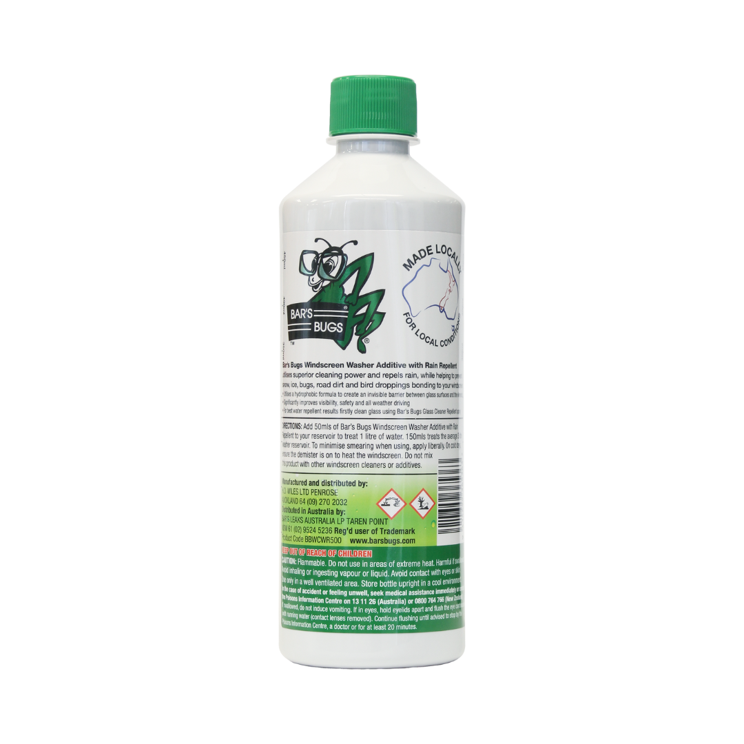 Bars Bugs Washer Additive with Rain Repellent harnesses the same cleaning power as our original Windscreen Cleaner, but with added rain-repellent benefits. It is specifically designed to keep your windscreen clean and protected from rain, sleet and snow for greater visibility.Β